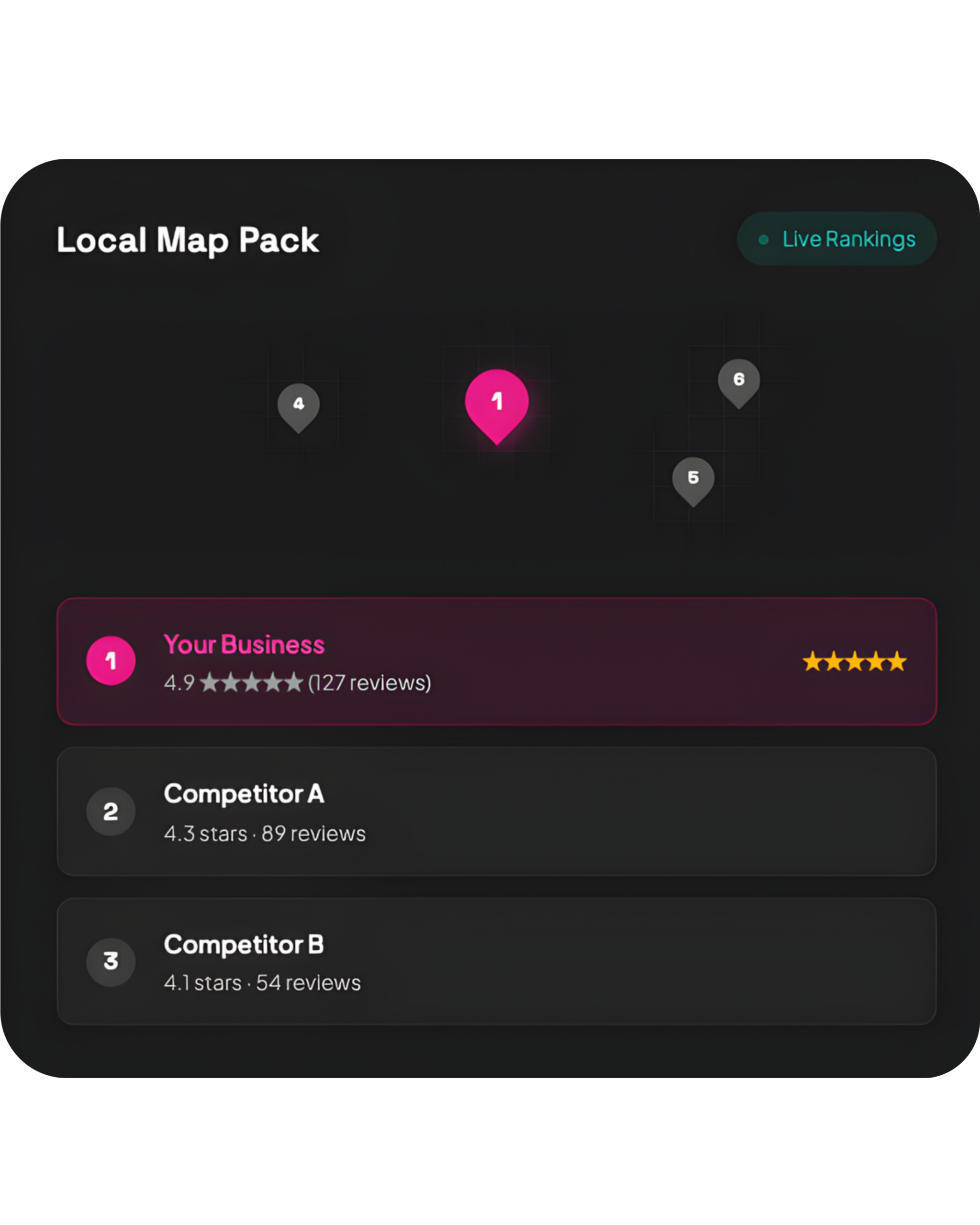 Everything you need to dominate local search—strategy, execution, and ongoing optimization.
